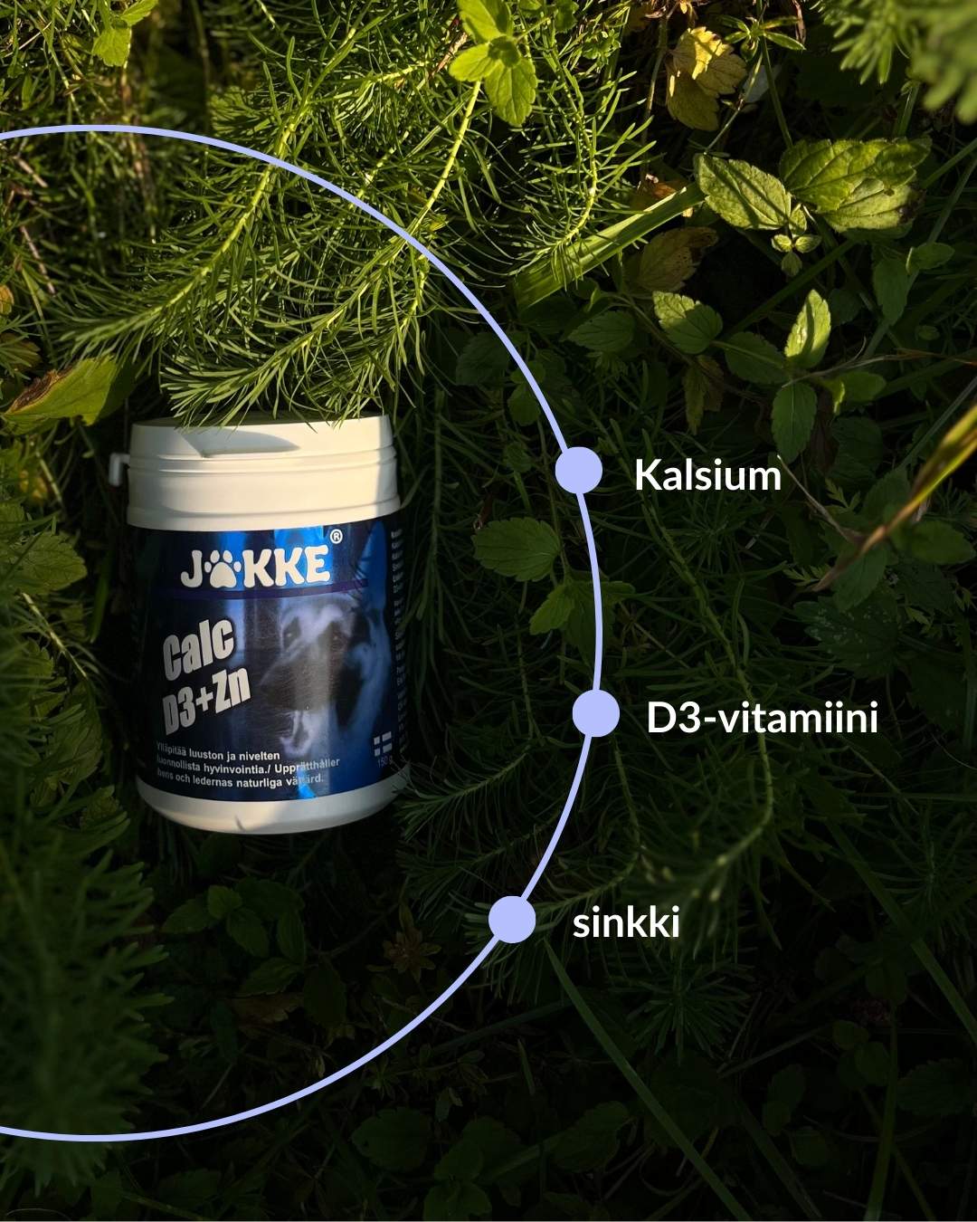 Jakke Calc D3+Zn supports the development of bones, joints, and teeth, as well as overall well-being. It contains calcium, vitamin D3, and zinc.