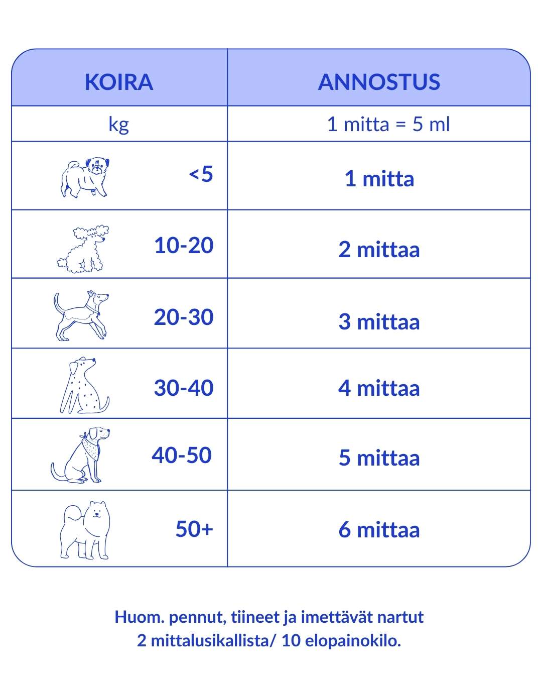 1 measuring spoon / 10 kg bodyweight; puppies, pregnant and lactating female dogs 2 measuring spoons / 10 kg bodyweight.