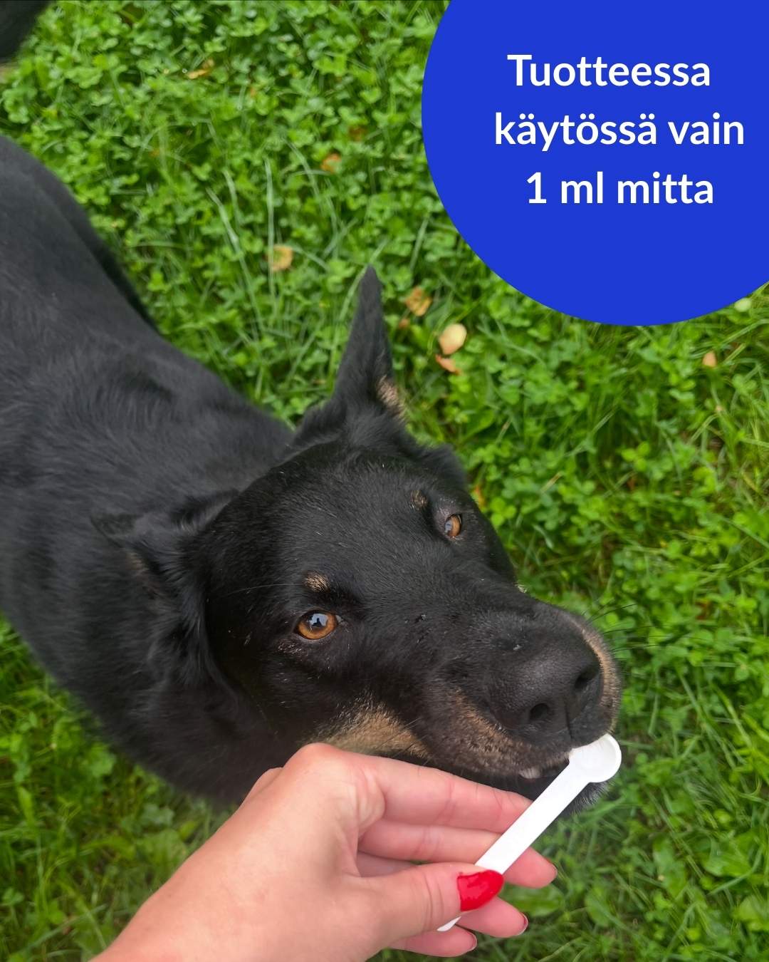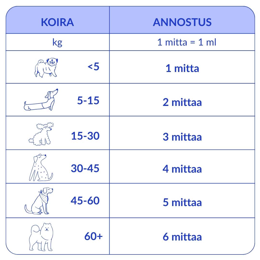 annostus päivittäin, sekoitetaan ruokaan, koiran painon mukaan (mitta 1 ml ~ 0,7 g):