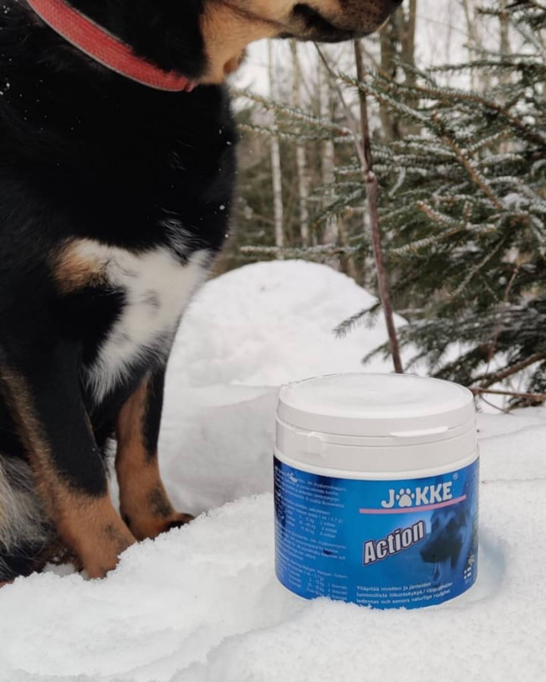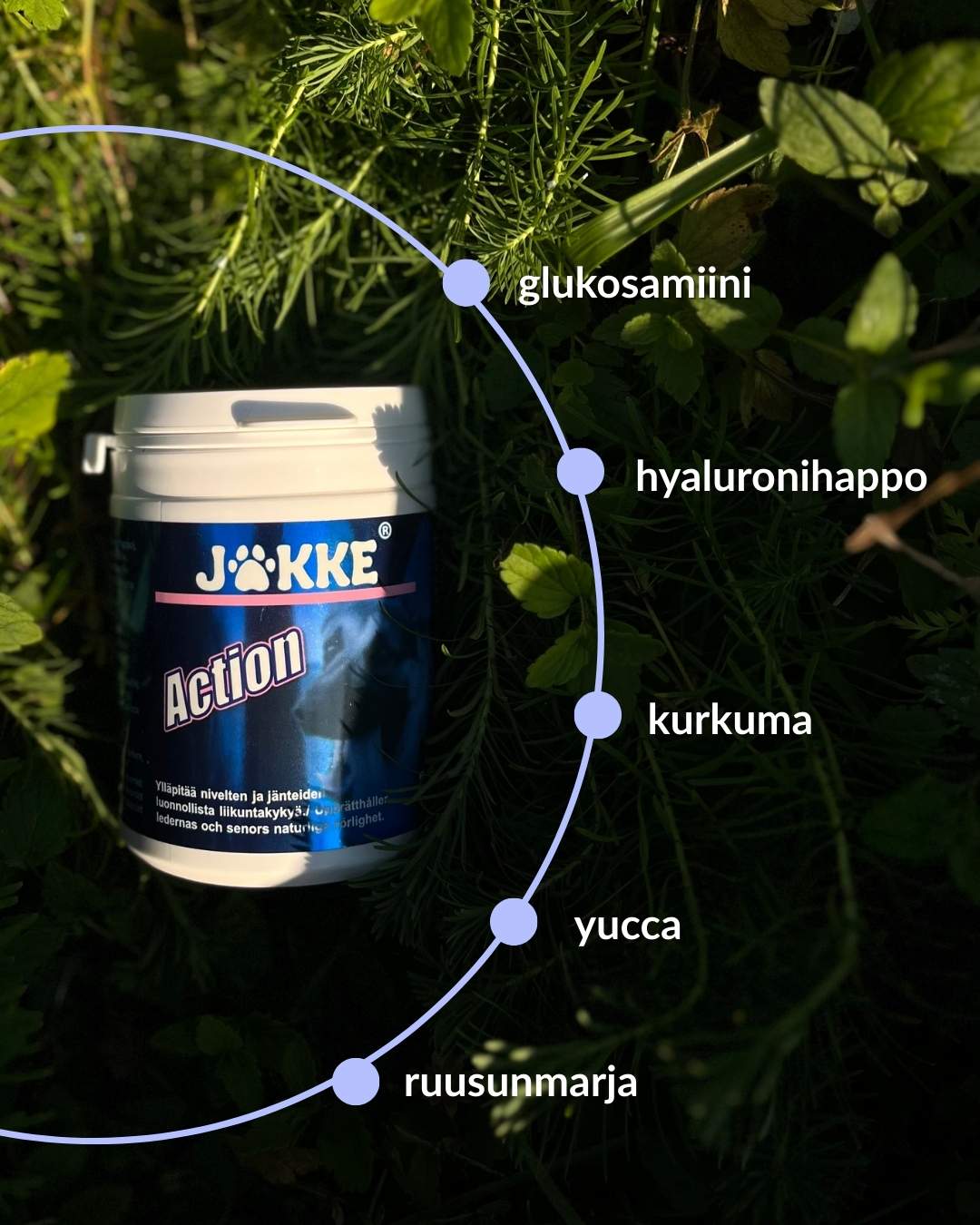 Herkkävatsaiselle ja nauta-allergikolle nivelravinne – Jakke Action on oikea valinta! Sisältää glukosamiinia, hyaluronihappoa, kurkumaa, yuccaa ja ruusunmarjaa.