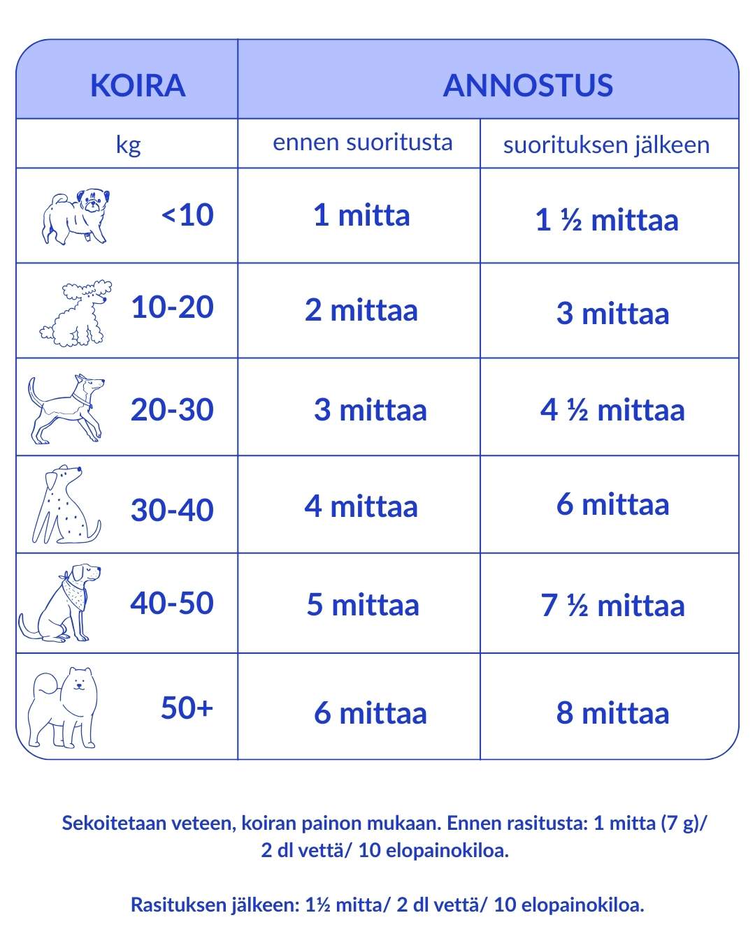 Sekoitetaan veteen, koiran painon mukaan. Ennen rasitusta: 1 mitta (7 g)/ 2 dl vettä/ 10 elopainokiloa, voi antaa esim. jo 1-2 päivää ennen ja suoritusaamuna ja pari tuntia ennen suoritusta useita kertoja pieniä määriä. Rasituksen jälkeen: 1½ mitta/ 2 dl vettä/ 10 elopainokiloa.