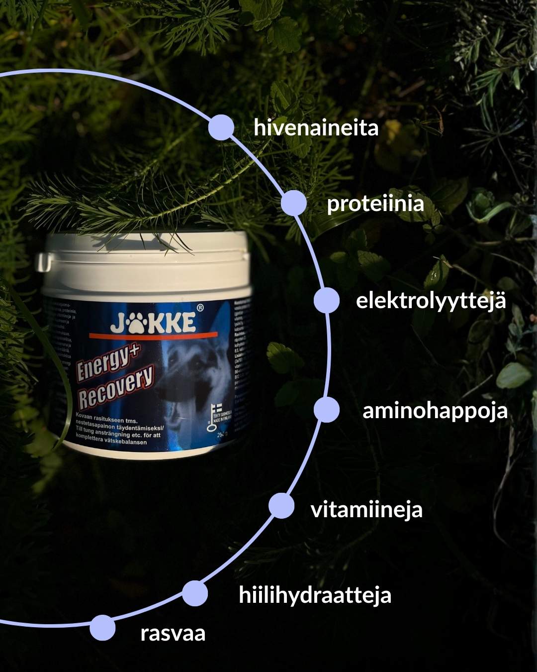 Jakke Energy+Recovery on energiapitoinen ja palautumista tukeva juomajauhe koirille. Se auttaa ylläpitämään nestetasapainoa ja jaksamista erilaisissa tilanteissa – erityisesti kuumalla säällä ja kovassa rasituksessa.