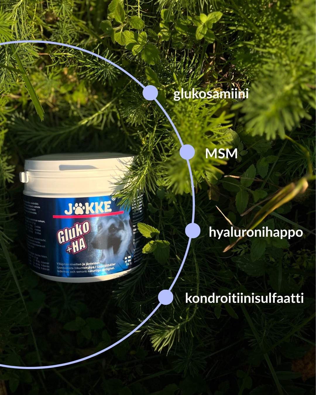 Jakke Gluko+HA on laadukas ja suosittu lisäravinne koirille ja kissoille nivelten terveyden tueksi. Valmiste sisältää vaikuttavat aineet – glukosamiini, kondroitiinisulfaatti, hyaluronihappo (HA) ja MSM – jotka yhdessä tukevat nivelten normaalia toimintaa, liikkuvuutta ja kokonaisvaltaista hyvinvointia.