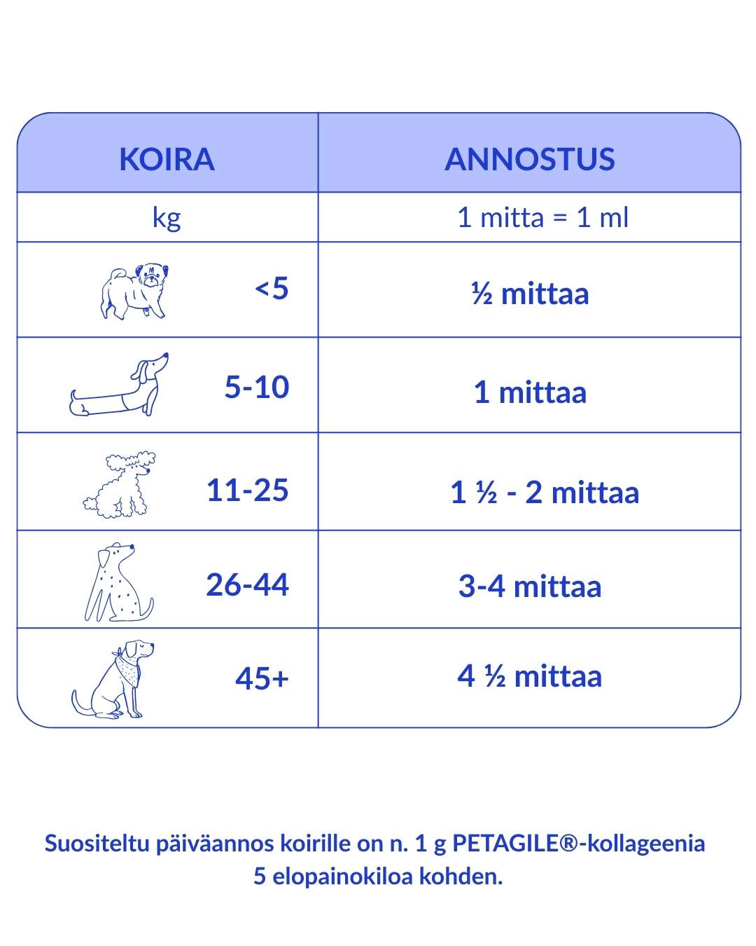 Suositeltu päiväannos koirille on n. 1 g PETAGILE®-kollageenia