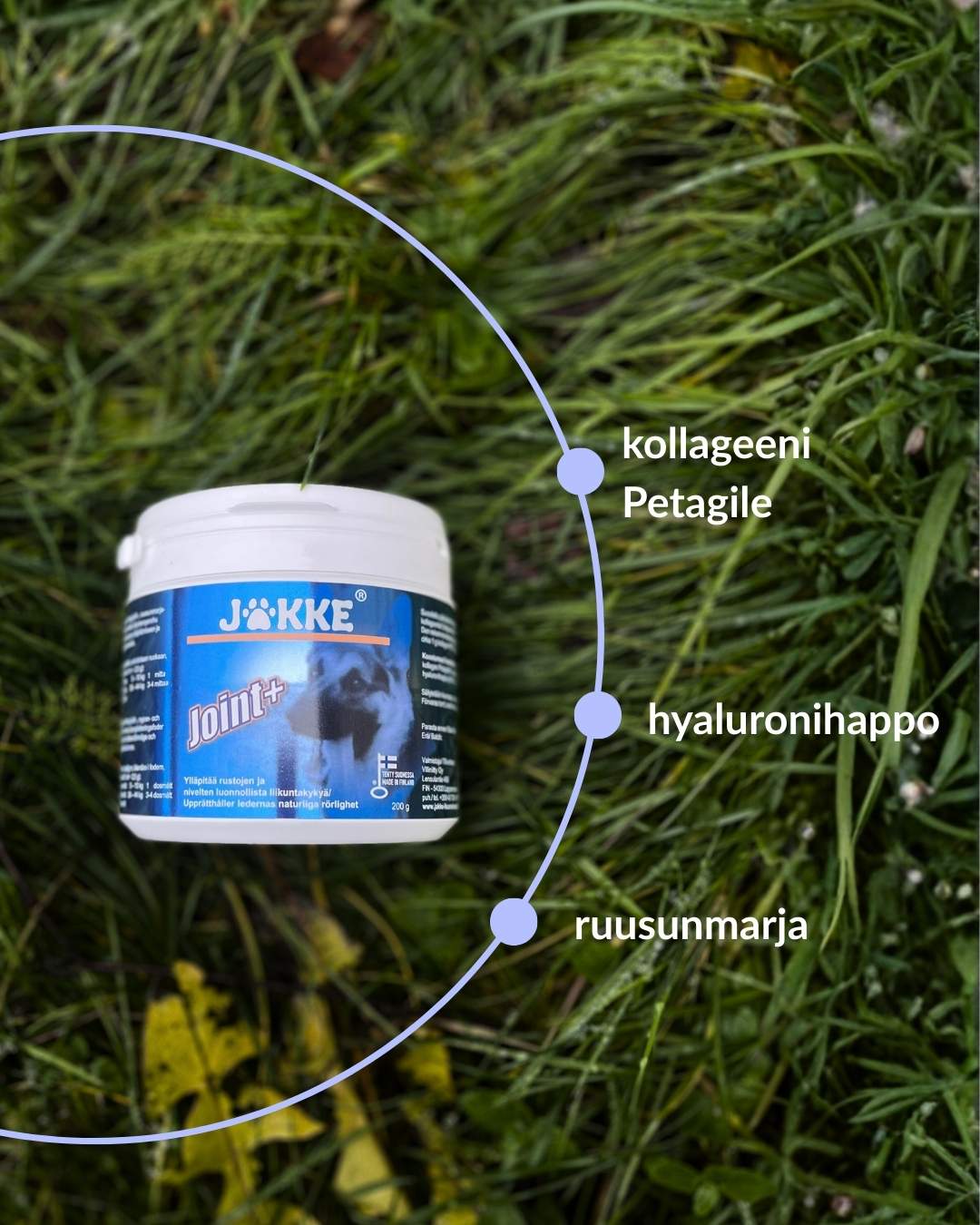 Jakke Joint+ on tehokas ja puhdas nivelten perustuote koirille, jotka tarvitsevat arkeensa luotettavaa tukea rustojen ja nivelten hyvinvoinnin ylläpitämiseen. Kliinisesti tutkittu Petagile®-kollageeni, ruusunmarja ja hyaluronihappo muodostavat kolmen vaikuttavan raaka-aineen tehokkaan yhdistelmän ilman täyteaineita – helppo ja edullinen tapa pitää koiran nivelet vetreinä päivittäin.