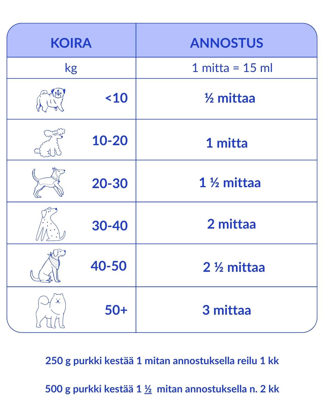 Käyttöohje: sekoitetaan ruokaan, koiran painon mukaan (mitta 15 ml ~ 6 g)